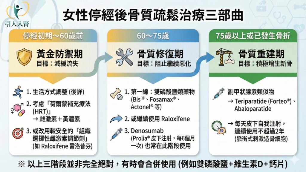 治療骨質疏鬆就像打一場仗,會根據患者的年紀與骨質狀況調整治療方式,我們可以將這場「骨質保衛戰」分為三個階段: