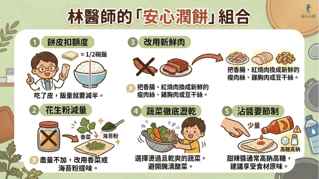 對於需控制血糖或水分的透析腎友而言,這餐若吃了兩捲潤餅,米飯主食就必須大幅減少,或乾脆不吃。千萬別把潤餅當成「飯後點心」,以免血糖與體重失控。