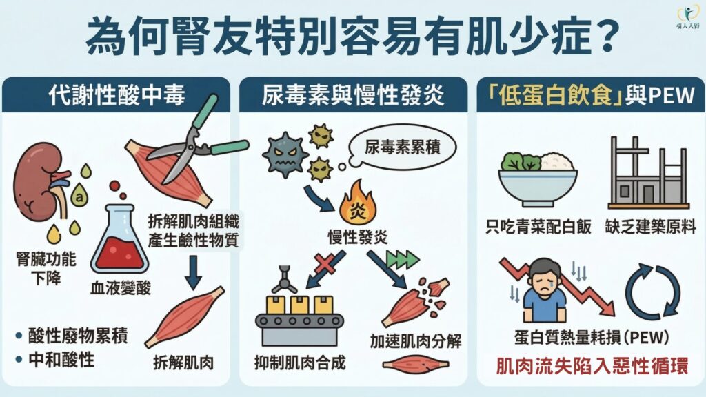 此外,尿毒素引發的慢性發炎,就像一場體內的微型森林大火,持續傳遞訊號抑制肌肉合成並加速分解。加上許多病友因畏懼洗腎,而過度執行「低蛋白飲食」,甚至只敢吃青菜配白飯。在缺乏建築原料的情況下,身體被迫進入蛋白質熱量耗損(PEW)狀態,讓肌肉流失陷入惡性循環。