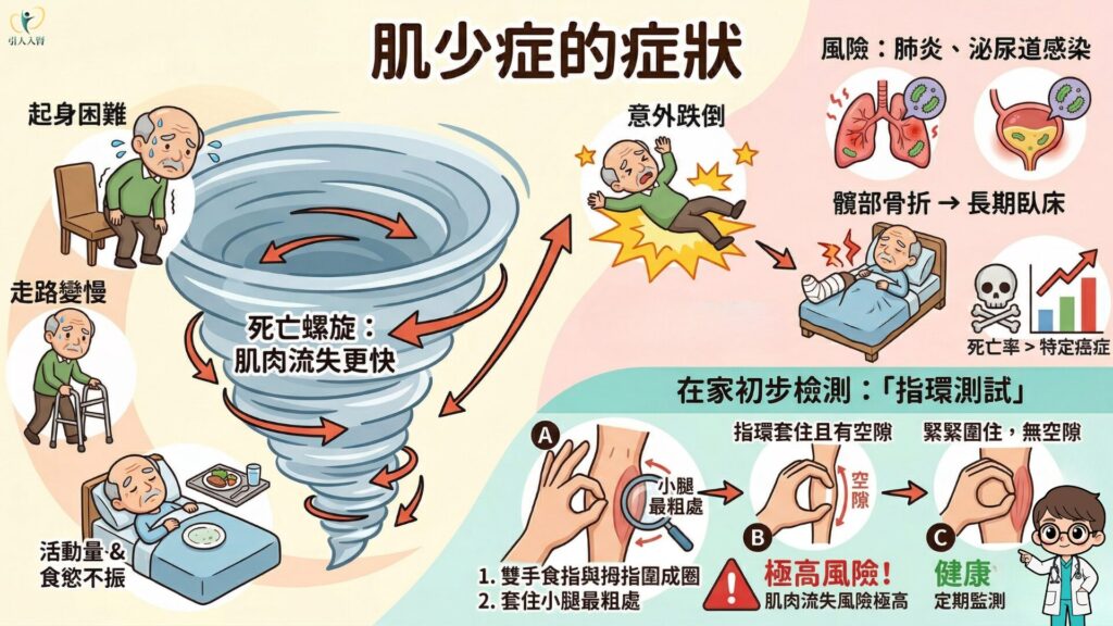 若想在家初步檢測,可以使用最簡單的「指環測試」:用雙手的食指與拇指圍成一個圈,套住自己小腿最粗的地方。如果指環能輕易圈住小腿,甚至還有明顯空隙,就代表肌肉流失的風險極高,必須立即尋求醫療團隊的協助。