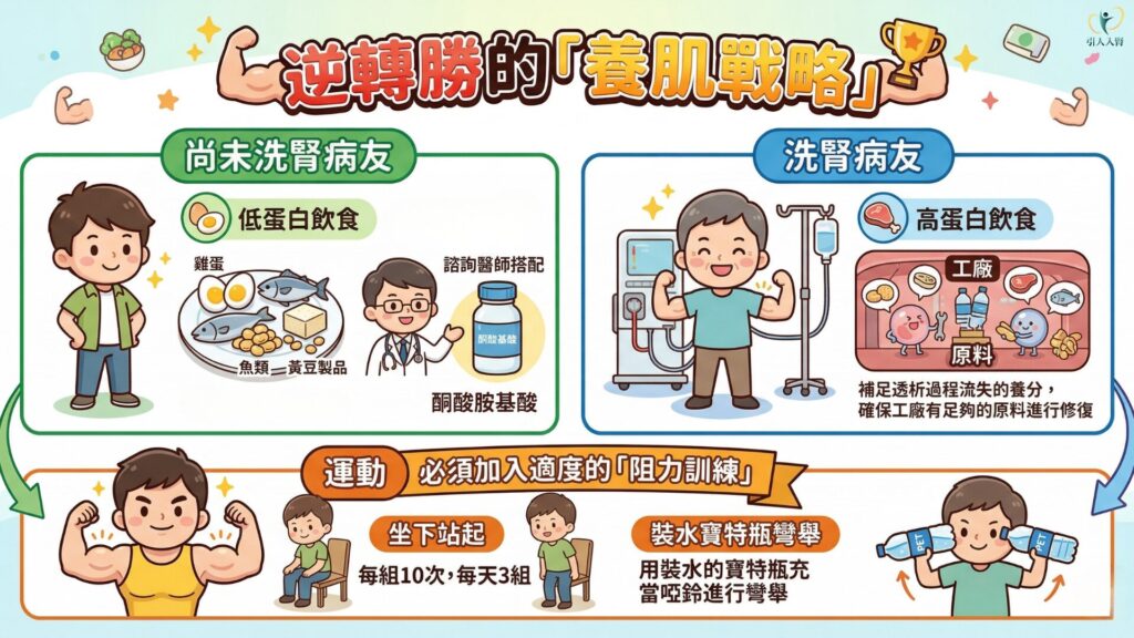 要逆轉肌少症,必須採取精準策略。首先是飲食邏輯的翻轉:尚未洗腎的病友需採取「吃得巧」的低蛋白飲食,應優先選擇雞蛋、魚類、黃豆製品等「高生物價蛋白質」,並諮詢醫師搭配「酮酸胺基酸」治療。酮酸能在體內轉化為營養,不僅不增加腎臟負擔,還能回收含氮廢物,是保肌護腎的神兵利器。